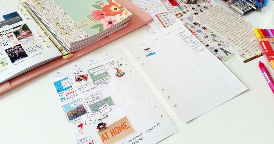 Jos kaipaa elämäänsä lisää luovuutta, sitä on helppo lisätä kalenteriinsa: piirtämällä ja käyttämällä värejä, tarroja, leikekuvia ja leimasimia. Värien, kuvien ja tekstien yhdistäminen voi olla terapeuttista ja oivalluksia herättävää. Millaisia asioita teen? Mistä pidän? Mistä nautin? Millaista elämää haluan elää?