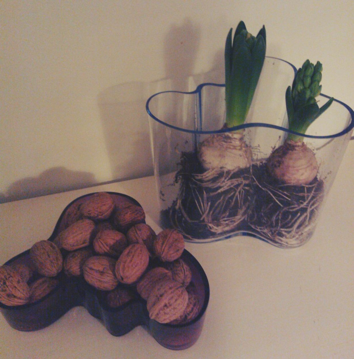 Sain idean sisustuslehdestä. Laitoin hyasintit ja saksanpähkinät Alvar Aallon vaaseihin ja se toi ihanan lisän joulusisustukseen.