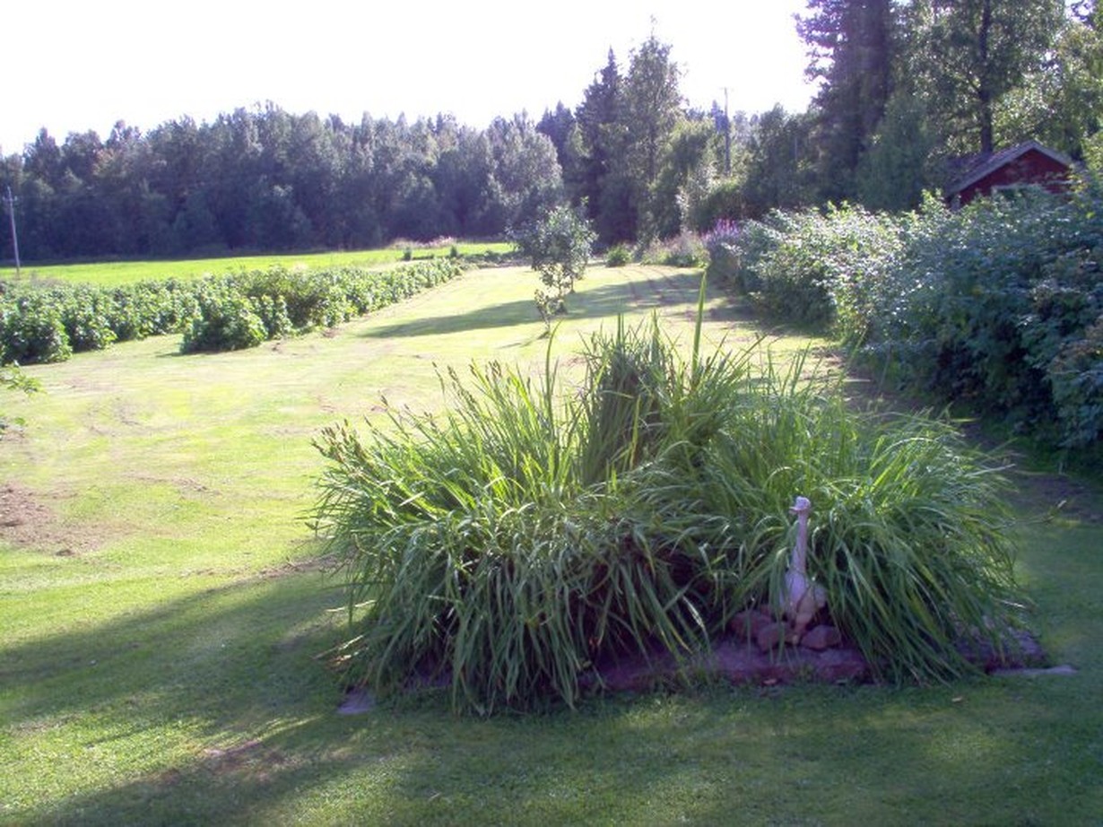 Tämä valkoinen ankka on vartioinut puutarhamme kurjenmiekkoja jo yli kymmenen vuotta. Syksyllä se siirtyy talvivarastoon, josta se kevään tullessa otetaan aina uudelleen esille vartiointitehtäviin.