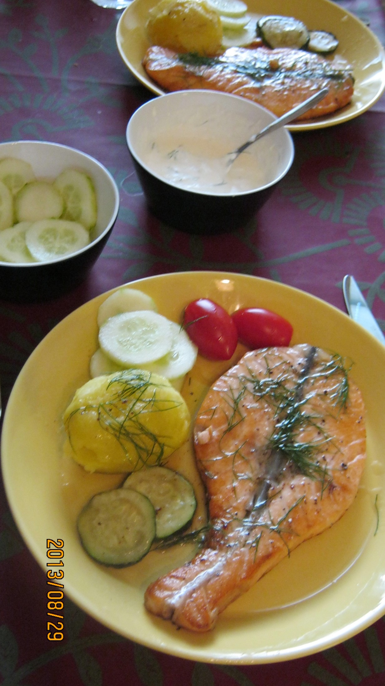 lohimedaljonki,peruna,kurkkua,tomaattia ja paistettua kesäkurpitsaa(omasta maasta) ja creme fraice-piparjuuriraastekastiketta. Aika hyvää