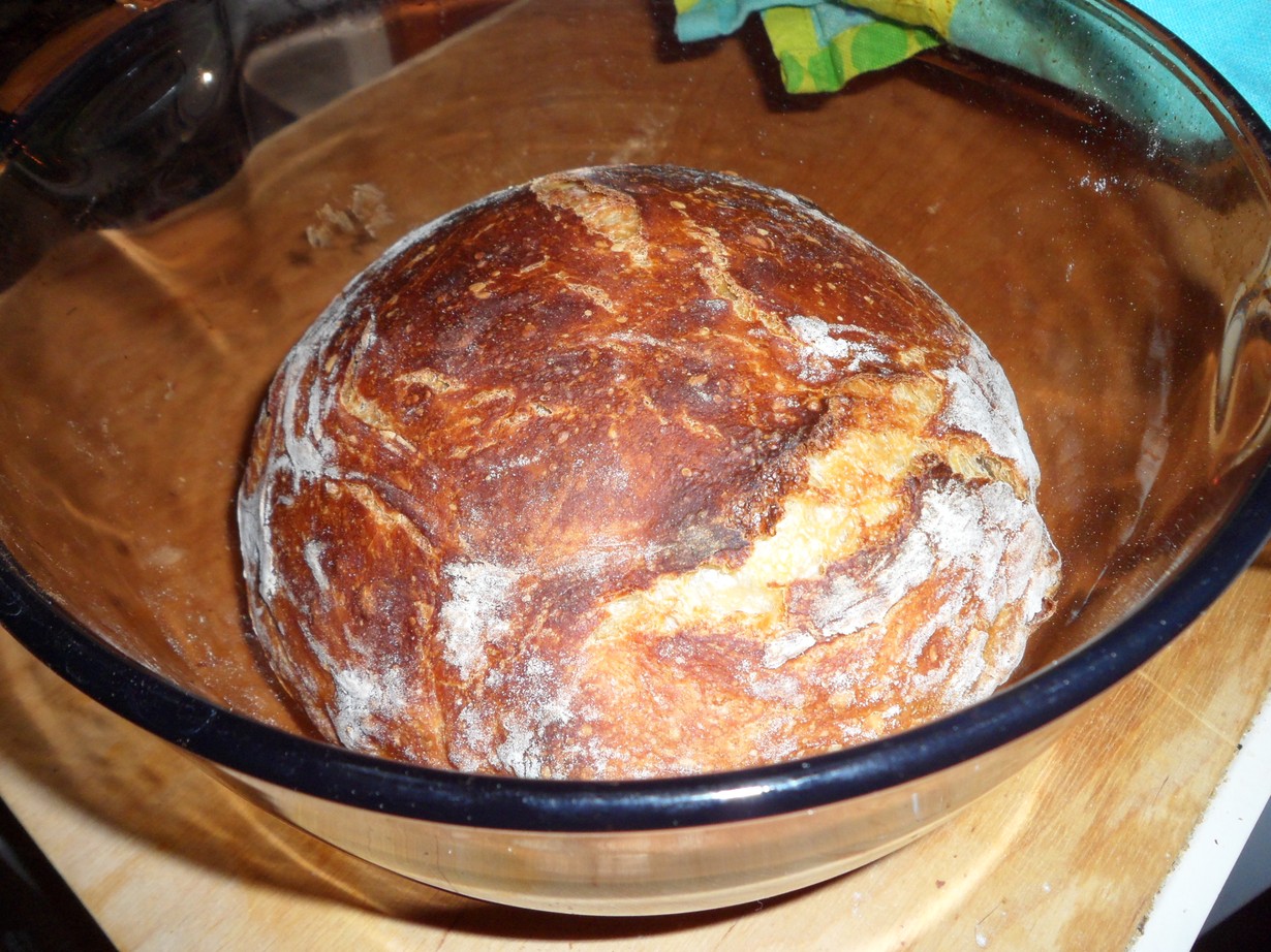 Kumoa taikina jauhotetulle pöydälle, taittele nopeasti palloksi, ÄLÄ VAIVAA. Jätä kohoamaan leivinliinan alle reiluksi puoleksi tunniksi. Laita kannellinen uunipata (n. 3l) kylmään uuniin. kuumenna uuni 225 asteeseen n. puoleksi tunniksi. Ota vuoka uunista, laita taikinapallo vuokaan (vuokaa ei tarvitse voidella) ja paista kannen alla 30 min. Ota kansi pois ja paista leipää vielä 15 min. Voit vaihdella jauhoja/mausteita oman makusi mukaan.