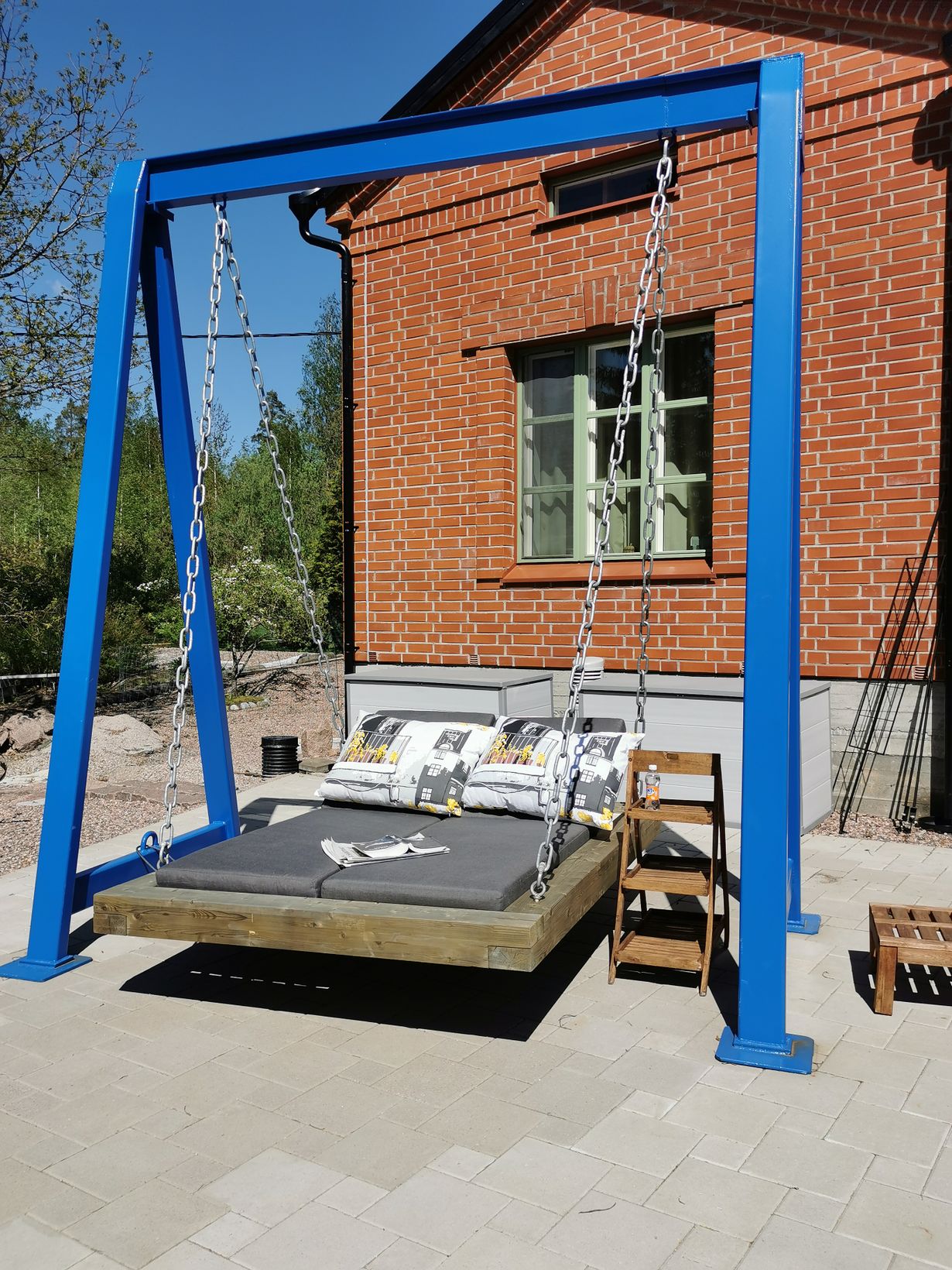 3,5 metriä korkea ja 3 metriä leveä teline on ollut teollisuuskäytössä isäni ja veljeni metallialan yrityksessä. Telineen avulla on pystytty nostamaan ja siirtämään painavia tavaroita esim. moottoreita. Useita vuosia käyttämättömänä ollut teline oli ruostunut ja menossa jo metallikierrätykseen. Näin siinä keinun aihion. Teline hiekkapuhallettiin ja maalattiin, jonka jälkeen mieheni teki siihen laverin. Nyt se toimii pihallamme daybedinä. Veljeni kuoli joitakin vuosia sitten onnettomuudessa ja teline on myös muisto veljestäni. Veljenpoikani on jo varannut telineen itselleen, kun muutamme pois omakotitalosta – milloin se sitten tapahtuukin.