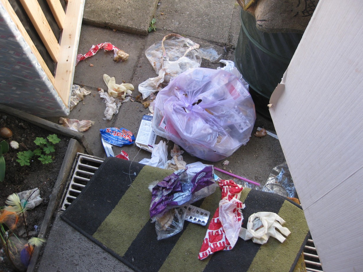 Roskis unohtui viedä illalla. Se kökötti suljetussa rivitalon sisäpihassa. Kun aamulla vilkaisin ikkunasta olivat harakat nokkineet sen hajalle ja talousjäte- ja ym. pitkin portaita. Iiik!