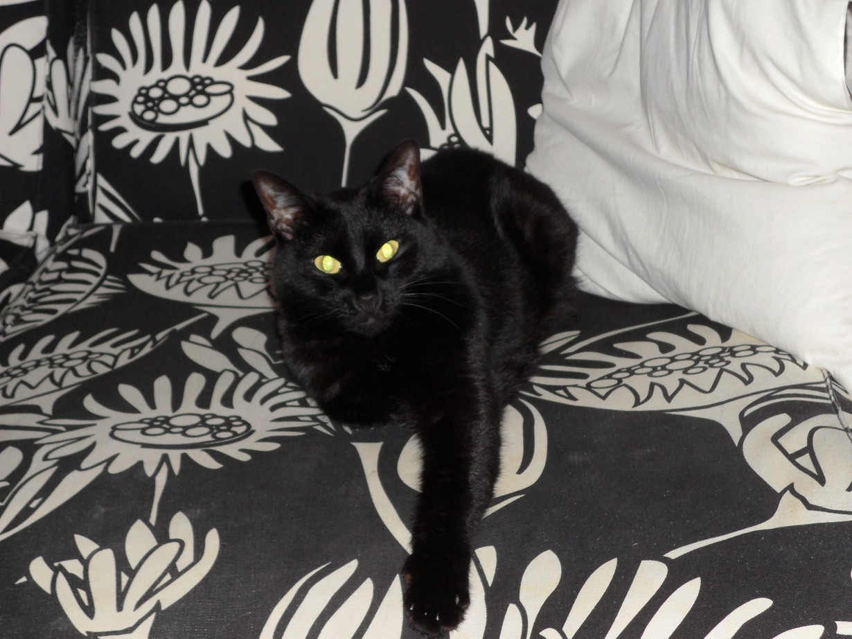 Menin hakemaan poikakissaa, joka olisi saanut nimen Onni Armas, mutta tulimmekin kotiin pienen mustan tyttökissan kanssa ja olimme jo puolessa matkassa kotiin kun tajusin ettei tästä neidistä nyt Onni Armasta tulisikaan... Silloin tyttäreni muisti että olen aina puhunut että jos vielä olisin tyttären saanut niin hänen nimensä olisi Helmi Orvokki. Niin tästä pienestä mustasta karvalapsestani tuli Helmi Orvokki. Ja sehän onkin aivan helmi nimeksi!
