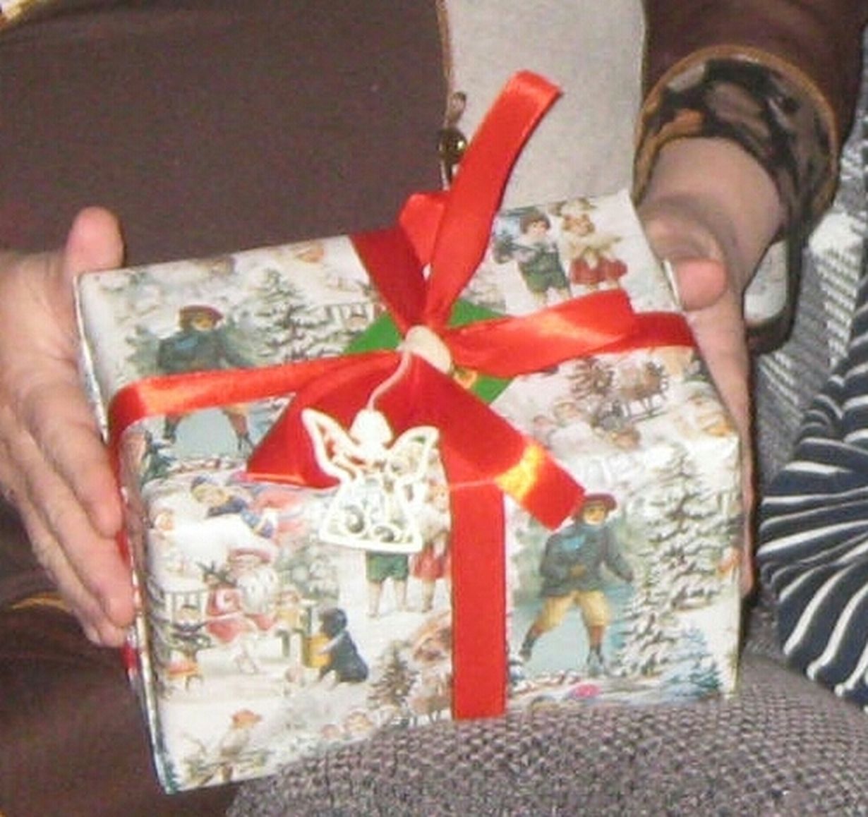Saatu joulupaketti oli kuin hurmaus: haaleita vanhanaikaisia joulukuvia paperissa, punainen leveä silkkinauha ja valkoinen kuulas enkelikoriste. Suoinen pakettikortti.