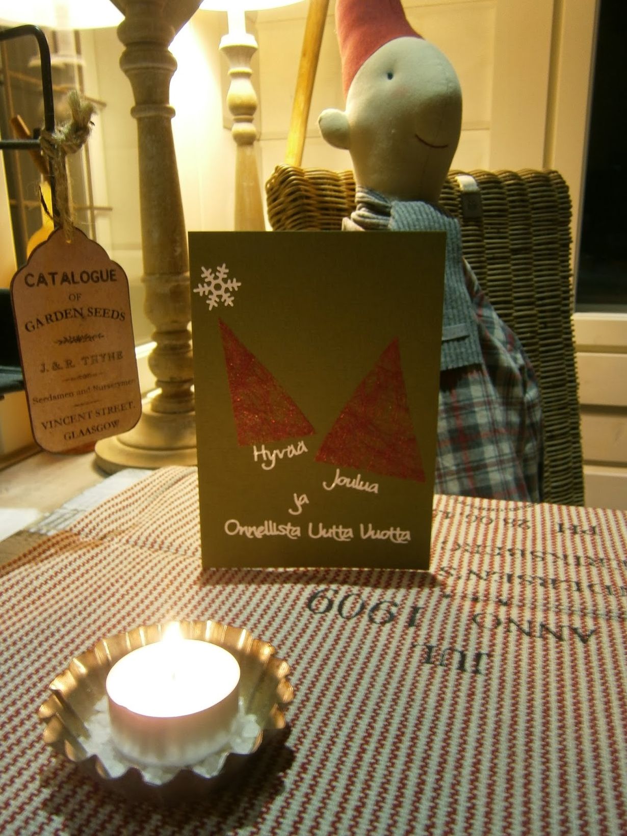 Lähes tyttäremme syntymästä lähtien olen tenhyt joulukortit itse, yhdessä tyttären kanssa. Myöhemmin myös pojan. Nyt molemmat asuvat jo omillaan mutta, olen jatkanut korttien teko perinnettä. Joka vuosi sukulaiset ja ystävät saavat meiltä itse tehdyn joulukortin postilaatikkoonsa.