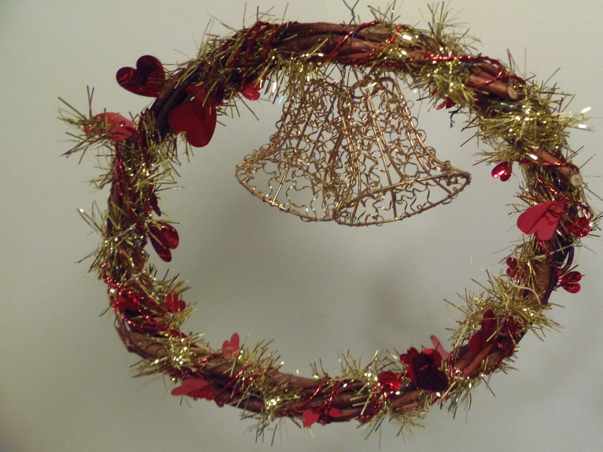 Kranssi on valmistettu kierrätys materiaalista. Vanha havukranssin pohja, käytöstä poistettuja joulukuusen koristenauhoja sekä särkyneen valoketjun kellot.