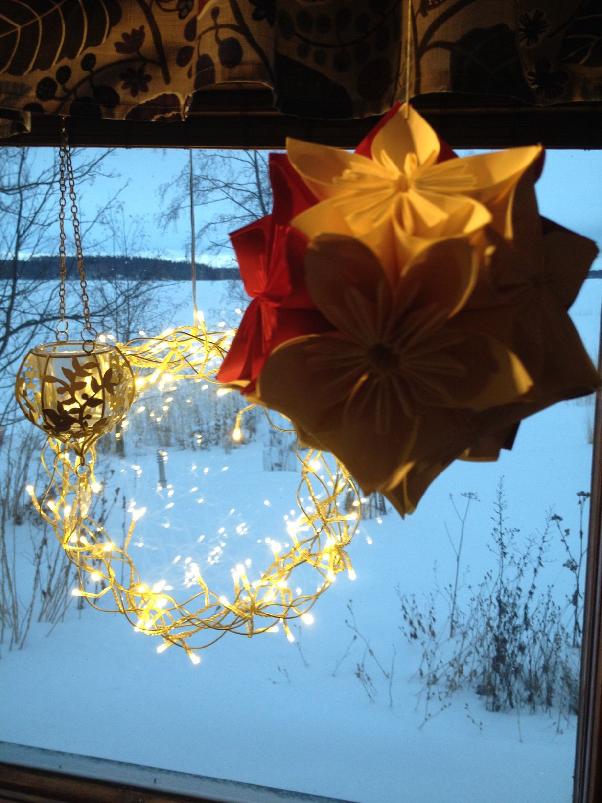 Ikinä en ole hallinnut minkäänlaisia käsitöitä tai askartelua, yleensä kaikki on täysin epäonnistuneita. Mutta tähän joulukukkaseen ihastuin niin, että väkipakolla askartelin. Pallo vaatii 12 kukkaa, jossa kussakin on 5 taiteltavaa terälehteä, eli hommaa oli!