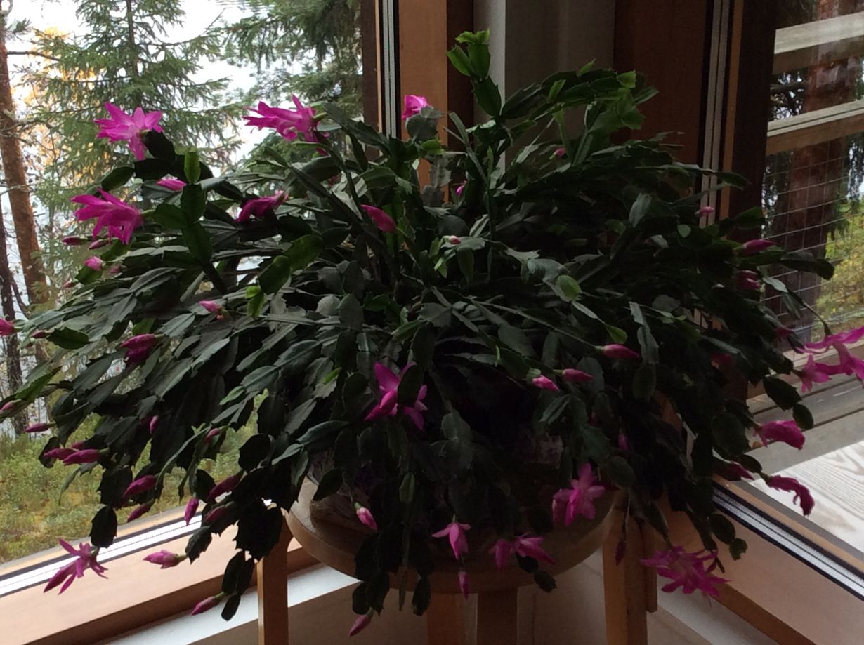 Kaktus lepää kesän terassin penkillä.Kun ensimmäiset nuput alkavat kehittyä, kaktus pääsee sisälle. Sitten kukinta riittää marraskuusta jouluun taas pääsiäiseen. Käännä kaktusta lienee ainoa hoito kesäkautena.
