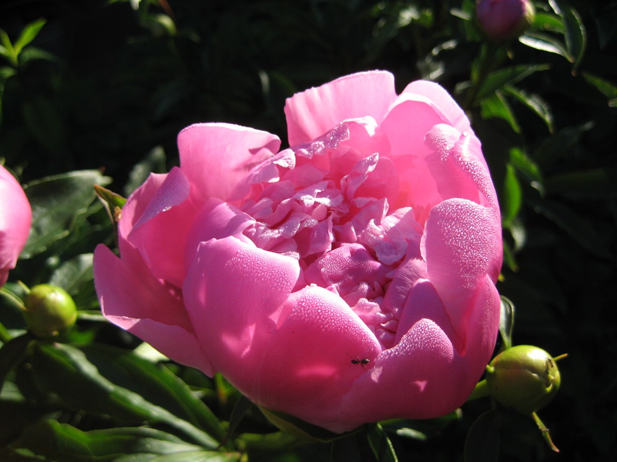 Aamu varhaisella askeleeni hiipi kukkapenkkini luo.Odotuksien täyttymys,kesän ensimmäinen pioninkukka oli avautumassa,yönkaste ja muurahainen terälehdillä.