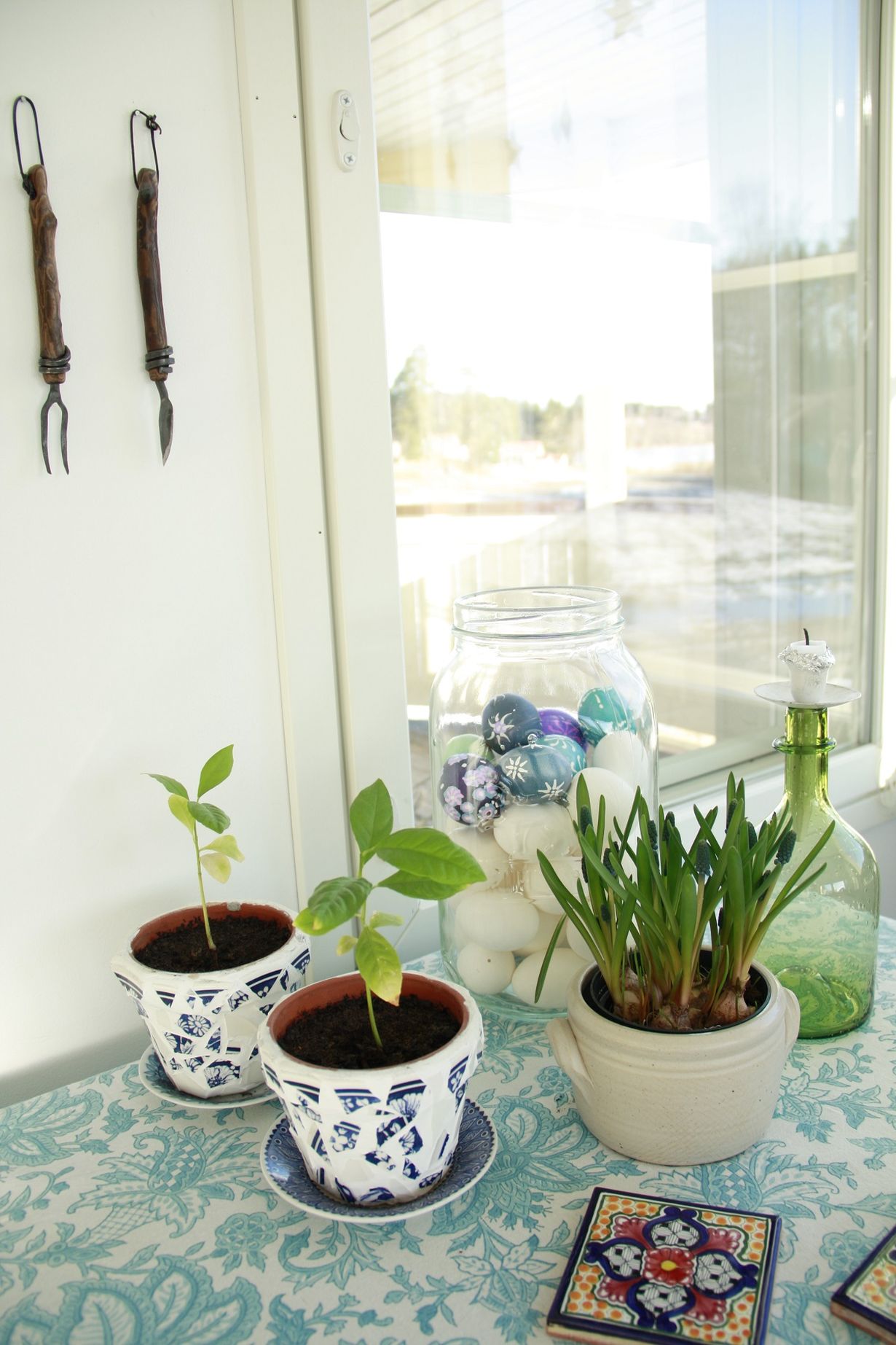 Kevätpöytäliinan laitan viimeistään helmikuussa. Ensin ostan tulppaaneja, sitten helmililjoja. Myös itse tehdyt batiikkimunat laitan esille hyvissä ajoin, ja mosaiikkiruukut lupaavat kevättä.