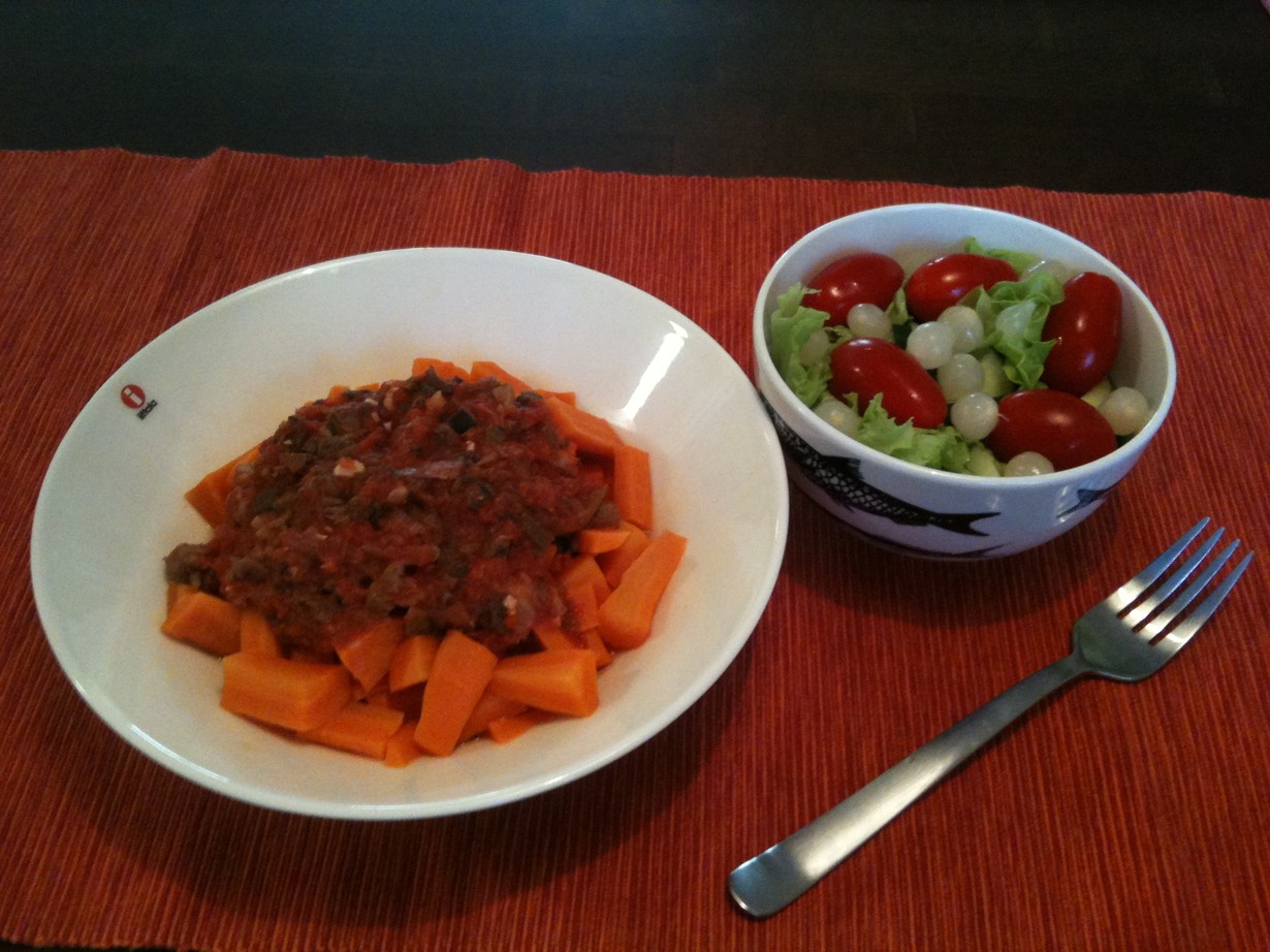 Arki-iltoina syödään tänä syksynä astetta kevyemmin: torstaina tarjolla höyrytettyjä porkkanoita ja sieni-purjo-tomaattikastiketta sekä lisukesalaatti. Tänään nautin ateriani oman keittiöpöydän ääressä yksin, koska mieheni lähti pitkäksi viikonlopuksi reissuun. Arkena katan ruokailuvälineistä pöytään pelkän haarukan, koska laiskuuttani vältän kaikkea ylimääräistä tiskiä.