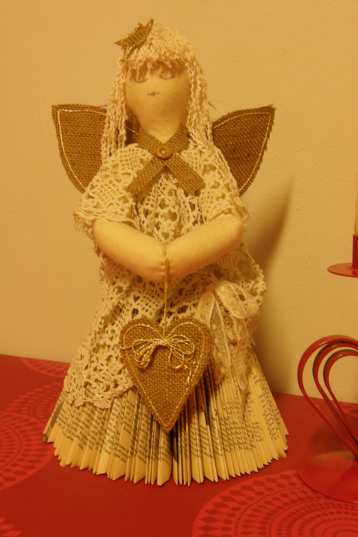 Vanhasta kirjasta taiteltu enkelinmekko,mummon virkkaama pitsiliina hartioilla,pätkä vanhaa pitsiä,vartalo lakanakankaasta,siivet ja sydän pestystä vanhasta kaurasäkistä,jota on aikoinaan paljon käytetty.