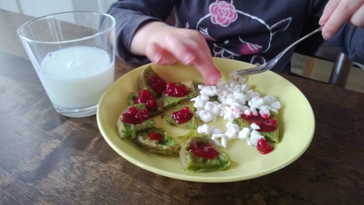 Kiireinen torstai-iltapäivän päivällinen. 3-vuotiaan lapsen ehdotuksesta kaupassa päädyttiin pinaattilettuihin. Niitä syötiin koko perheen voimin raejuuston ja mummon tekemän omenapuolukkahillon kera.