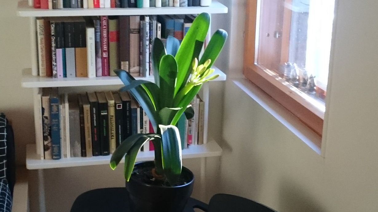 Kliivia on levännyt talven hunningolla ja päästyään sisälle vierihoitoon alkoi tehdä kukkavanaa. Kuvassa kurkottaa kohden aamuauringon säteitä.