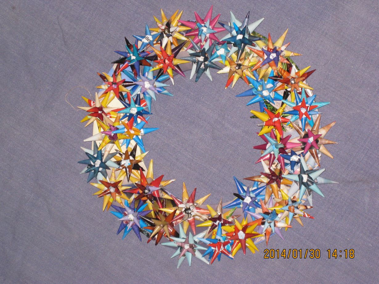 Aikakauslehdestä leikattu pyörylöitä, niihin leikattu aukileikkauksia melkein keskelle, kynän kärjen avulla kierretty sektorit terälehdiksi. Kolme kpl liimattu yhteen keskeltä ja ne liimattu paperilla päällystetylle pahvirenkaalle.