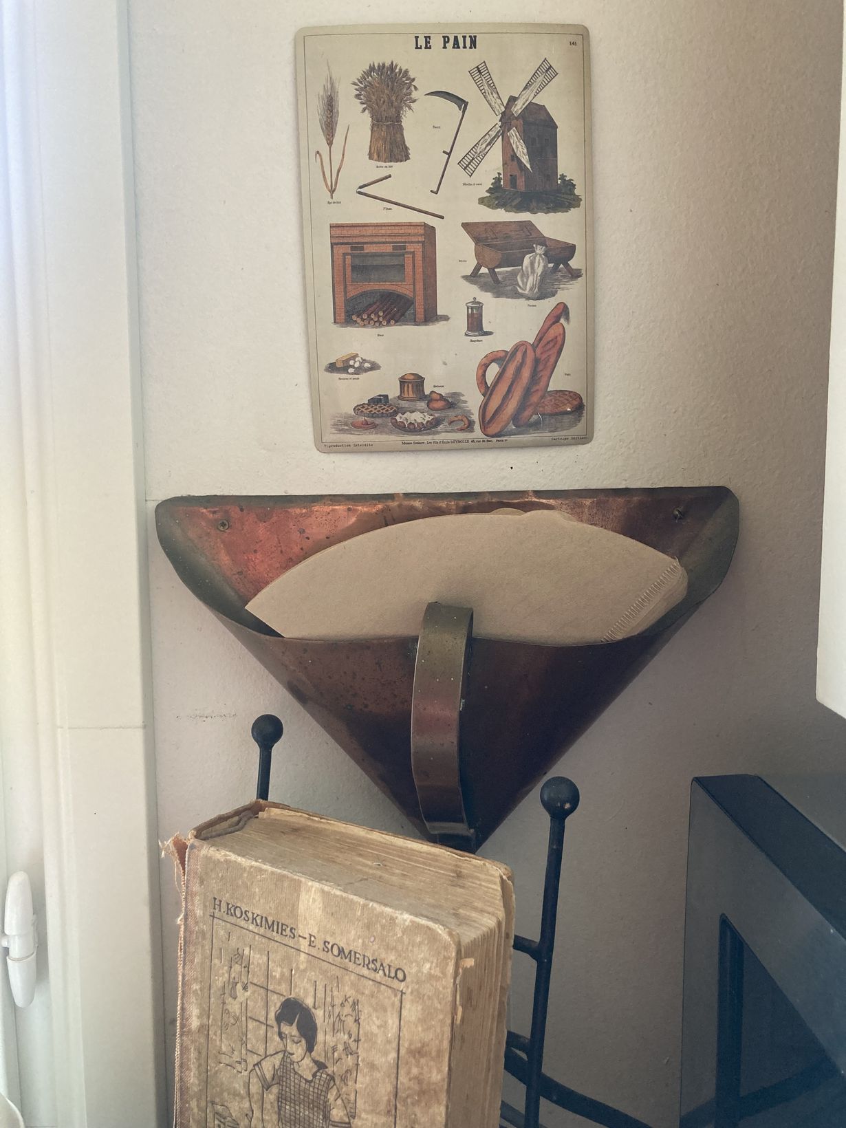 Vuosia sitten löysimme vanhan kuparisen rikkakihvelin Somerniemen kesätorilta, ja siitä saakka se on palvellut keittiössämme suodatinpussitelineenä. Meillä on muitakin silmääviehättäviä esineitä päässyt uuteen, niiden alkuperäisestä poikkeavaan tehtävään - puoliso on erikoistunut näihin luoviin ratkaisuihin!