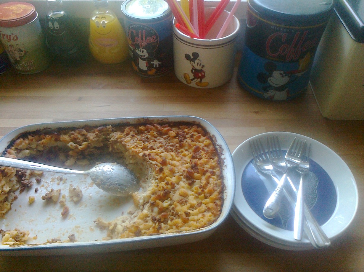 Makaroniloota, jota syömme ilolla viisihenkisen perheemme kanssa kolme päivää. Tänään on se kolmas päivä ja vielä maistuu. Taikana on emmentaljuustosta tehty juustokastike, joka tekee makaronilaatikosta erityisen täyteläisen.