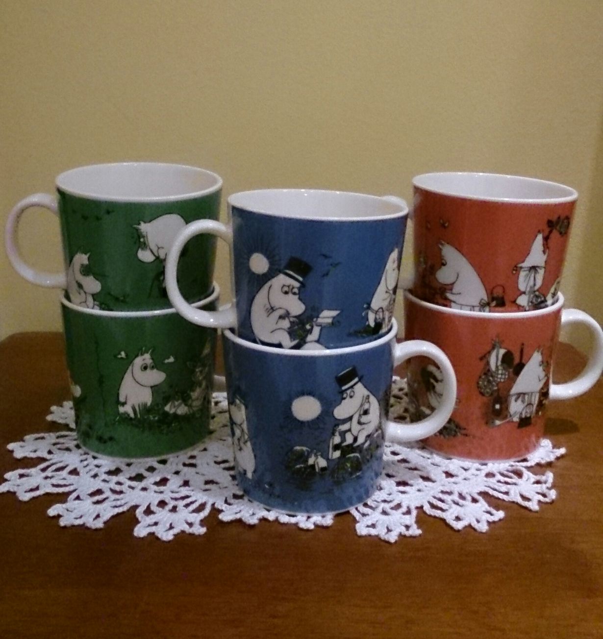 Ja näistähän se kaikki alkoi. Ensimmäisiä mukeja on aina tuplana, keltapohjaiset puuttuvat. Myöhemmin kokoelma on karttunut joka vuosi, varmaan 24 vuoden ajan. Mukeja on muuttanut tietenkin myös lasten mukana maailmalle. Omat suosikkini vaihtelevat, nyt kahvi maistuu joko uudesta seikkailumukista tai Tuutikki- mukista.