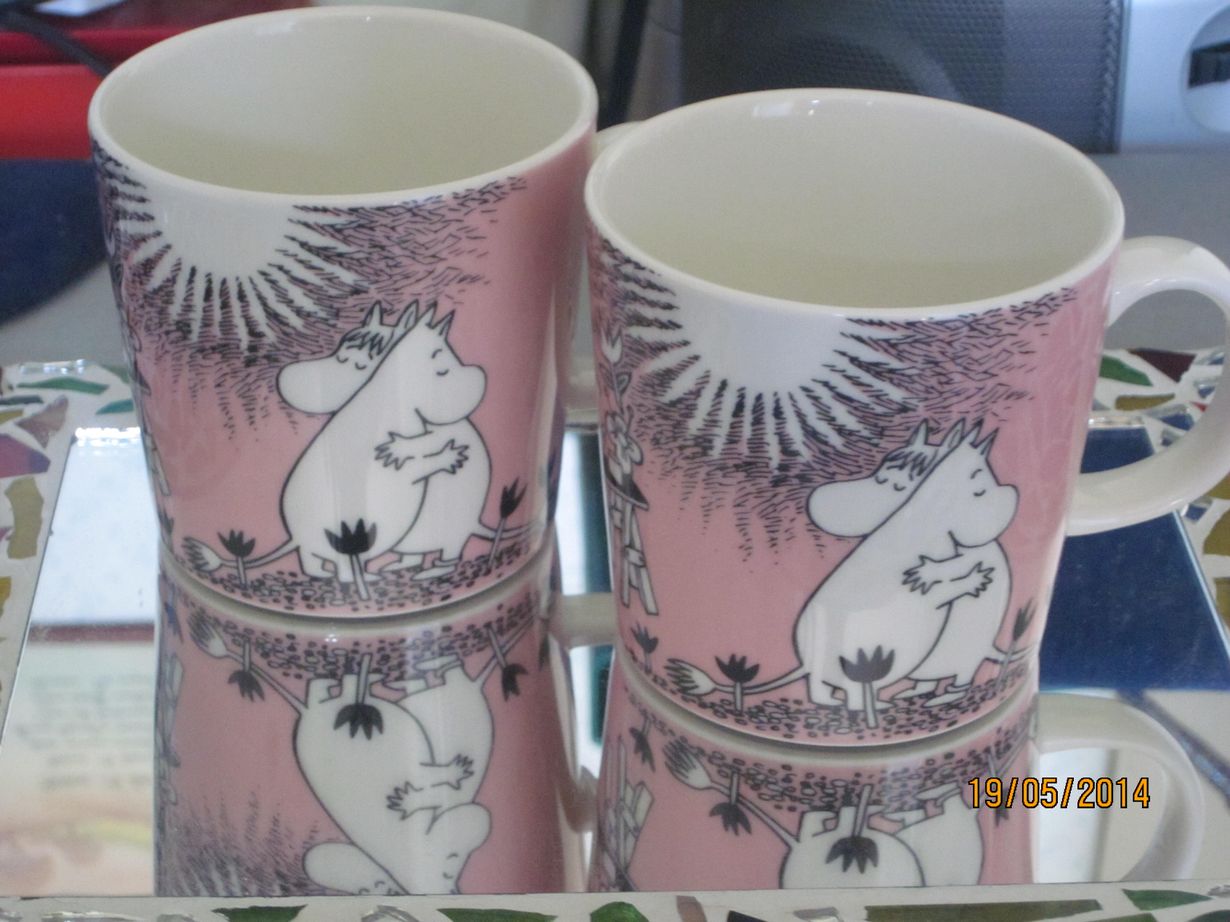 Muistoja muumimukeista muumipariskunta 19.5.2014 klo 14:25 nämä mukit sain halauskilpailusta, vanhasta valokuvasta, missä halataan katia