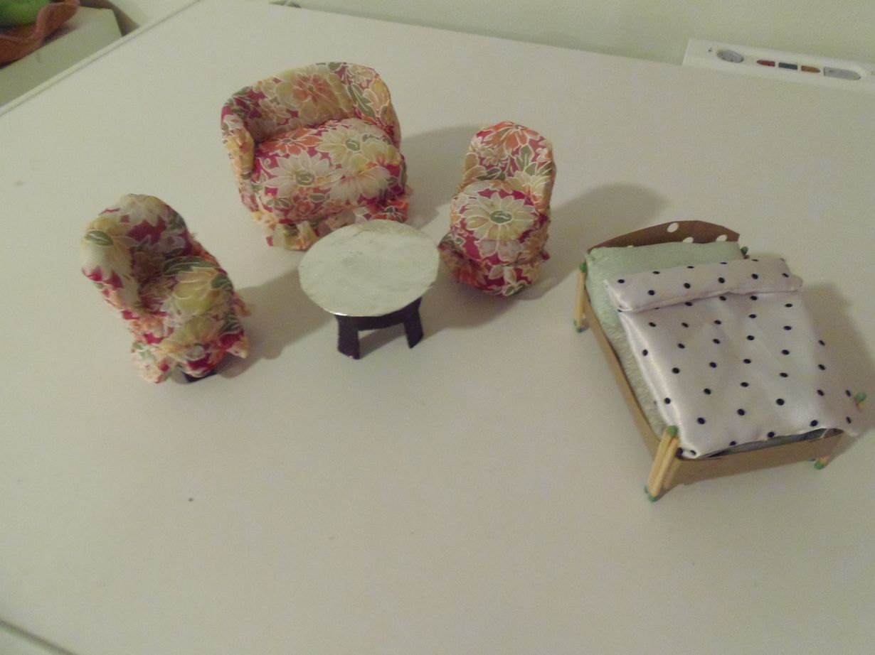 Kalusteet olen tehnyt kierrätysmateriaaleista. WC-pareri rullien hylsyistä , kangas-ja vanupaloista ja vanhaa kynsilakkaa maalina käyttäen