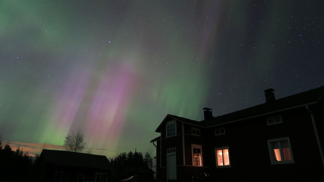 15.4.2015 taivas repesi vielä revontuliloistoon ja näytelmä näkyi Pohjanmaan korkeudella, kotipirttini pihamaalla Alavieskassa, jonne eivät yllä kaupunkien valosaasteet. Kuvaaja: Leena Mehtätalo. Kuvausaika 15.4.2015 klo: 00:24
