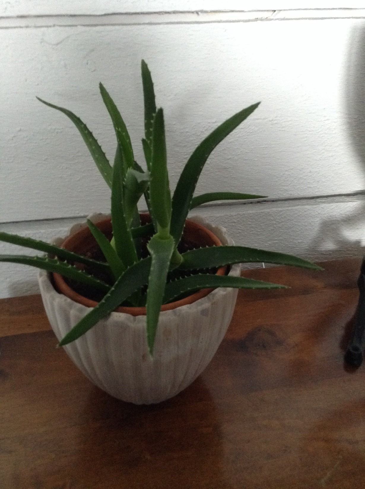 Tämä pieni suloinen Aloe on päässyt omaan ruukkuun vasta hiljakkoin. Sen isoksi kasvanut "emo" asustelee olohuoneessa, tämä pieni totuttelee omaan elämäänsä keittiön ikkunalaudalla. Alunperin Aloe on löytynyt työkaverin roskiksesta kuivaksi kituneena pienenä oksana. Vuosia kesti ennen kuin siitä kasvoi komea viherkasvi.