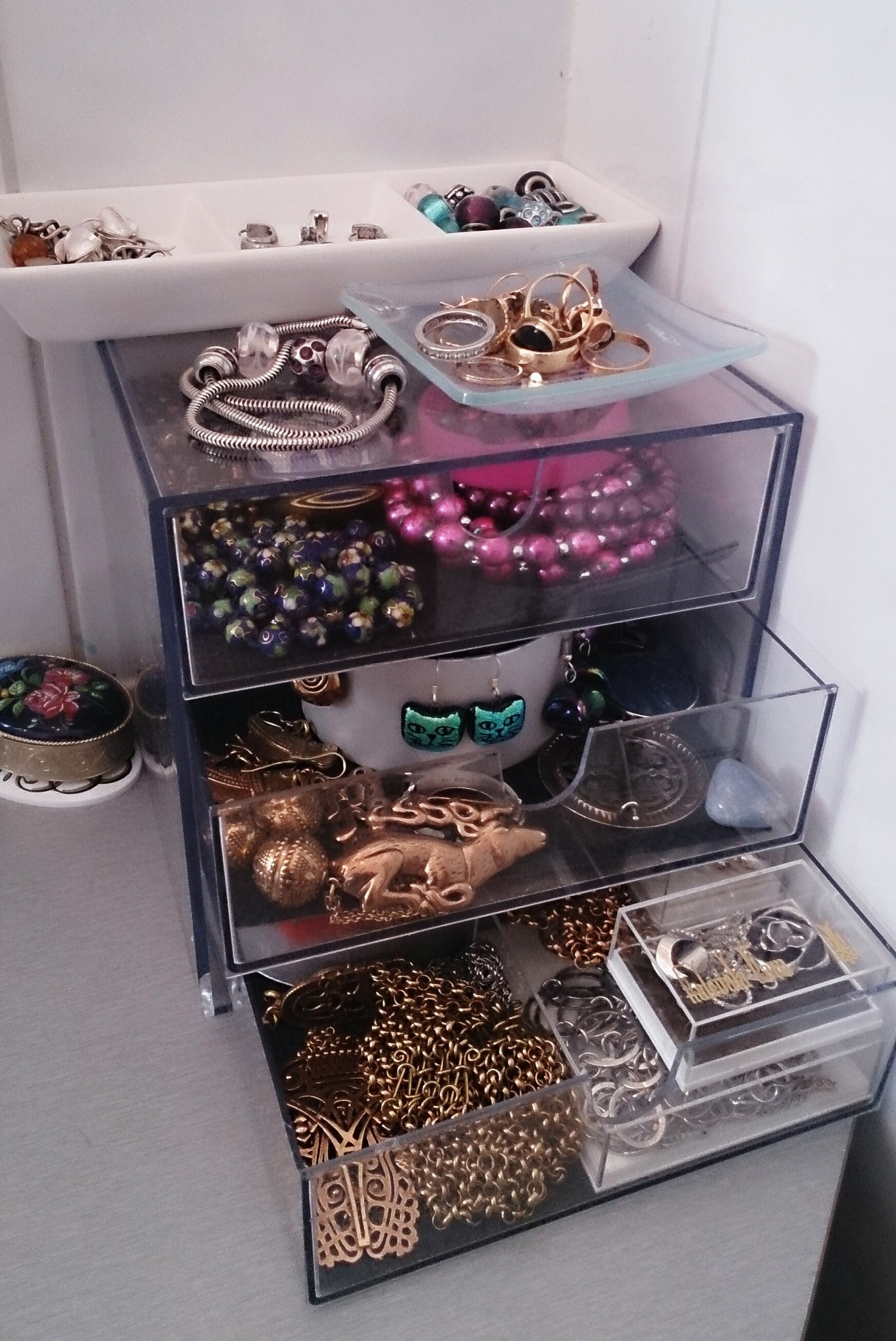 Muutama sitten keksin, että Palaset-laatikosta tulee oiva korurasia. Käyttössä olevat riipukset ja rannekorut ovat roikkumassa WC:n peilin tapissa.