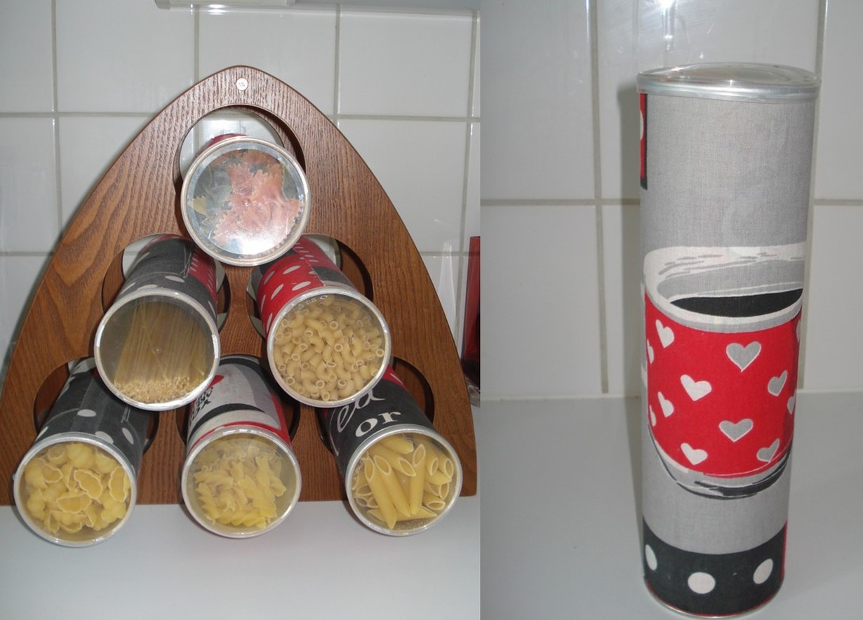 Perunalastupurkeista ja vanhasta viinipullotelineestä tuli mahtava pastalokerikko. Päällystin purkit keittiöaiheisella kankaalla. Läpinäkyvästä kannesta näkyy heti mitä purkki sisätää!