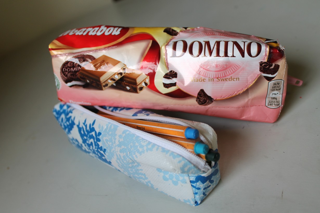 Ideat kiertoon! penaali pussista ja suklaalevyn paperista 13.8.2014 klo 18:47 alla on Luhta-pussista tehty penaali ja yllä on suklaalevyn paperista tehty penaali. heidi