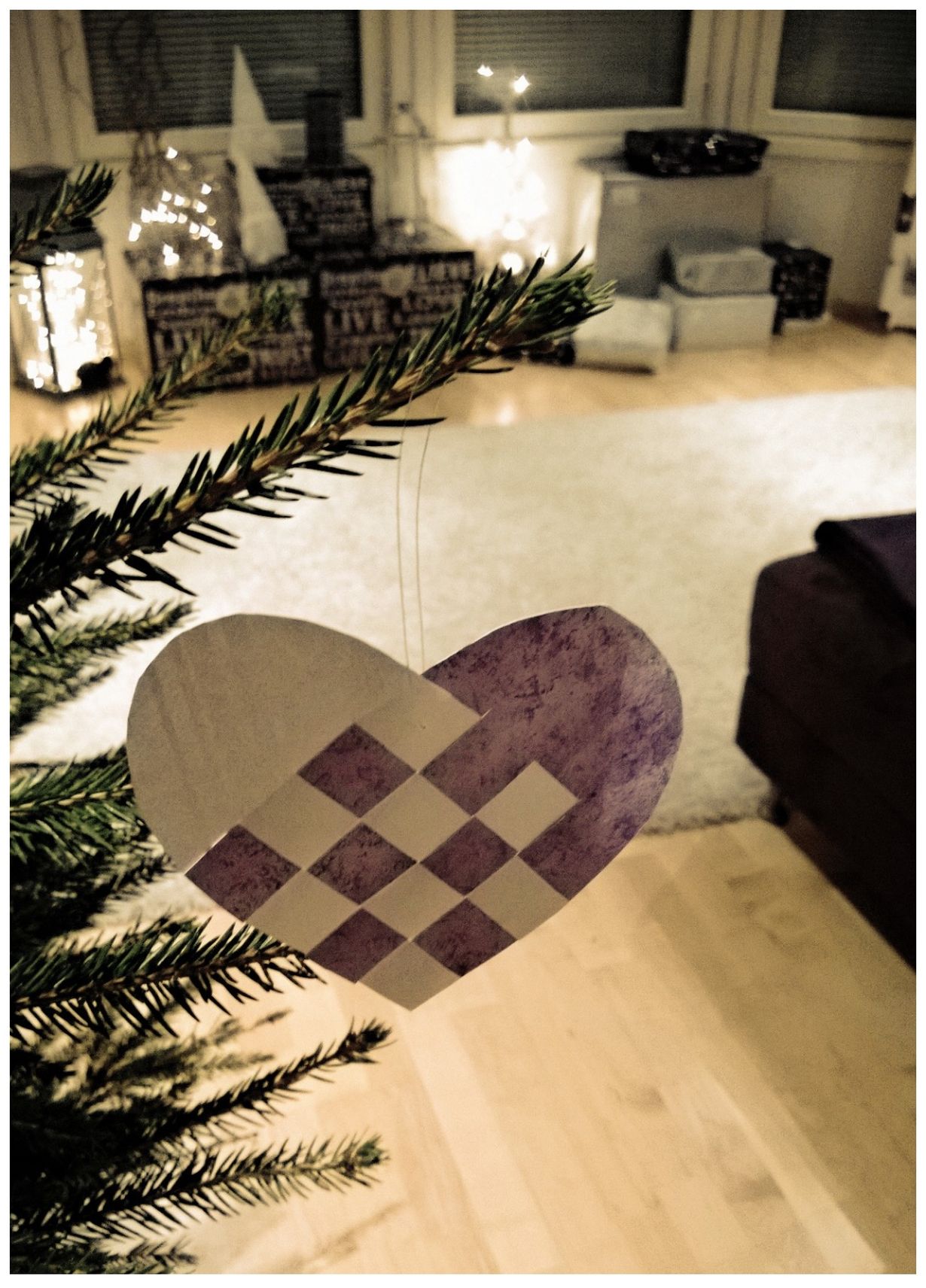 Paperisydän on punottu itse väsiväreillä maalatusta violetista paperista ja helmiäsien valkoisesta paperista.