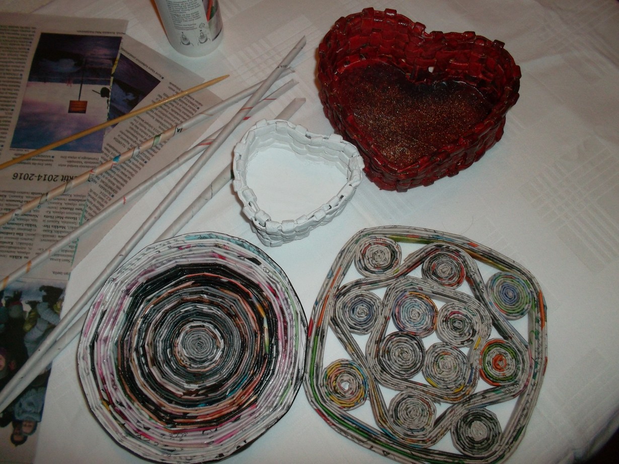 Sanomalehdistä ja aikakauslehdistä kierretään puikon avulla paperipinnoja jotka litistetään. Niistä voi punoa, kiertää kiekoiksi ja muotoilla erilaisia tuotteita. Kuvassa sydämenmuotoisia koreja ja pannunalusta sekä pieni lautanen. Tuote voidaan maalata akryyli- tai peiteväreillä sekä lakata jolloin niistä tulee lujempia ja kestäviä. Materiaalia riittää yllinkyllin näihin töihin, lisäksi tarvitaan vain liimaa ja värejä...