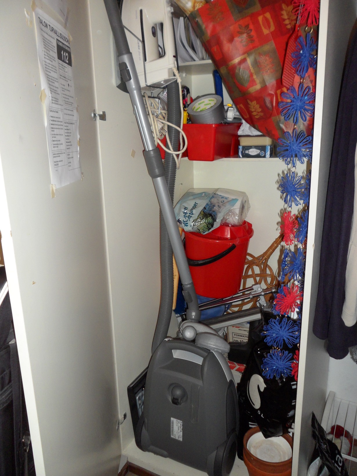 Siivouskomeroni on ihan tavallinen kaappi eli täysin epäkäytännöllinen. Tilaa vievät imuri, iso laatikollinen laattoja, laattaleikkuri, lattianpesusanko, työkalupakki, kissanhiekat, lahjapaketointitarvikkeet (näkyvät tuossa isossa paperikassissa), ynnä kaikki arjessa tarvittavat tilpehöörit ja hilavitkuttimet. Ainoa itselisäämäni mielestäni käytännöllinen asia on siltysraudan säilytysteline. Nyt on silitysraudallekin oma paikka!