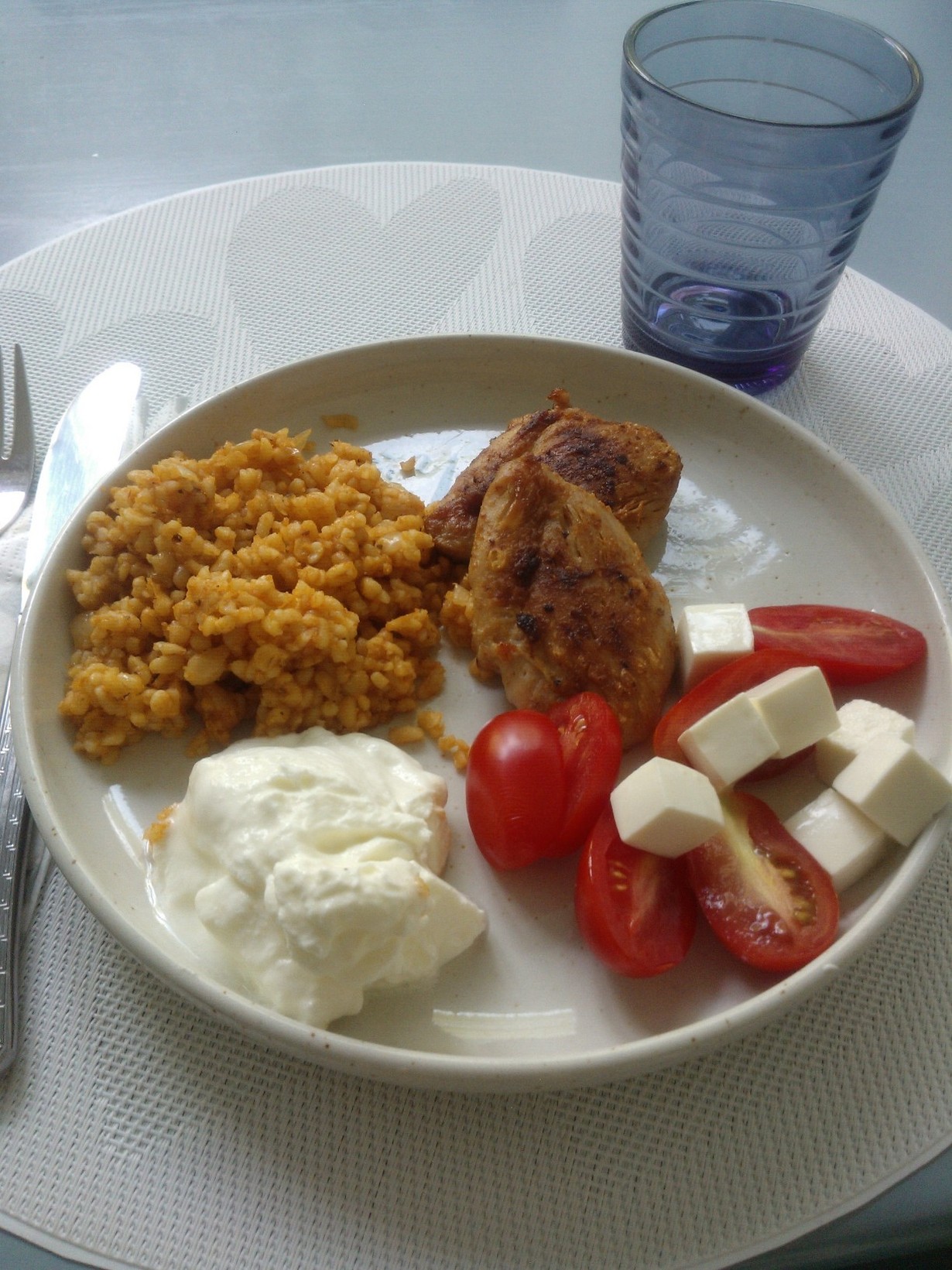 Olin vapaalla ja tytär sairaana kotona.Tein meille lounaaksi burguria ja paistoin broilerin paistipaloja.Kyytipojaksi oli turkkilaista jugurttia,tomaattia ja fetapaloja, Nopea,helppo,kevyt ja maukas ateria. Nam