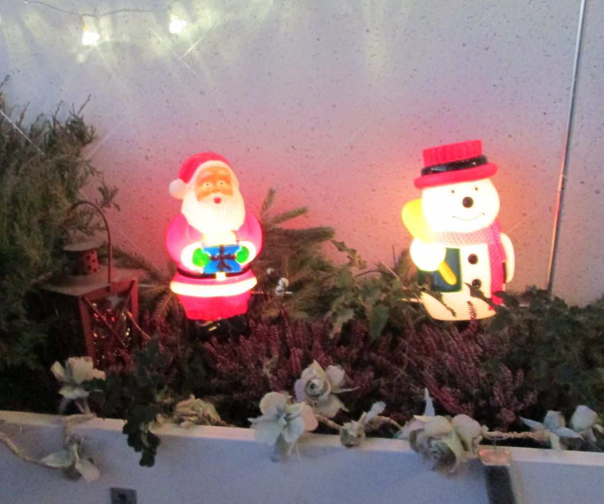 Lumiukko- ja joulupukki saivat täksi jouluksi paikan viherlaatikosta. Seuranaan maljakataja ja kanervat sekä vanha ruusuköynnös. Turvallisuussyistä lyhdyn sisällä kimaltavat kiiltävä köynnös ja kissansilmän palaset.