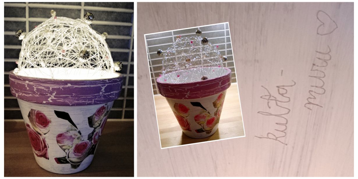 Maalattu ja ruususervetin palasilla koristeltu ruukku, jonka sisällä on pattereilla toimivat jouluvalot ja päällä helmi-hopealanka-koristepallo.