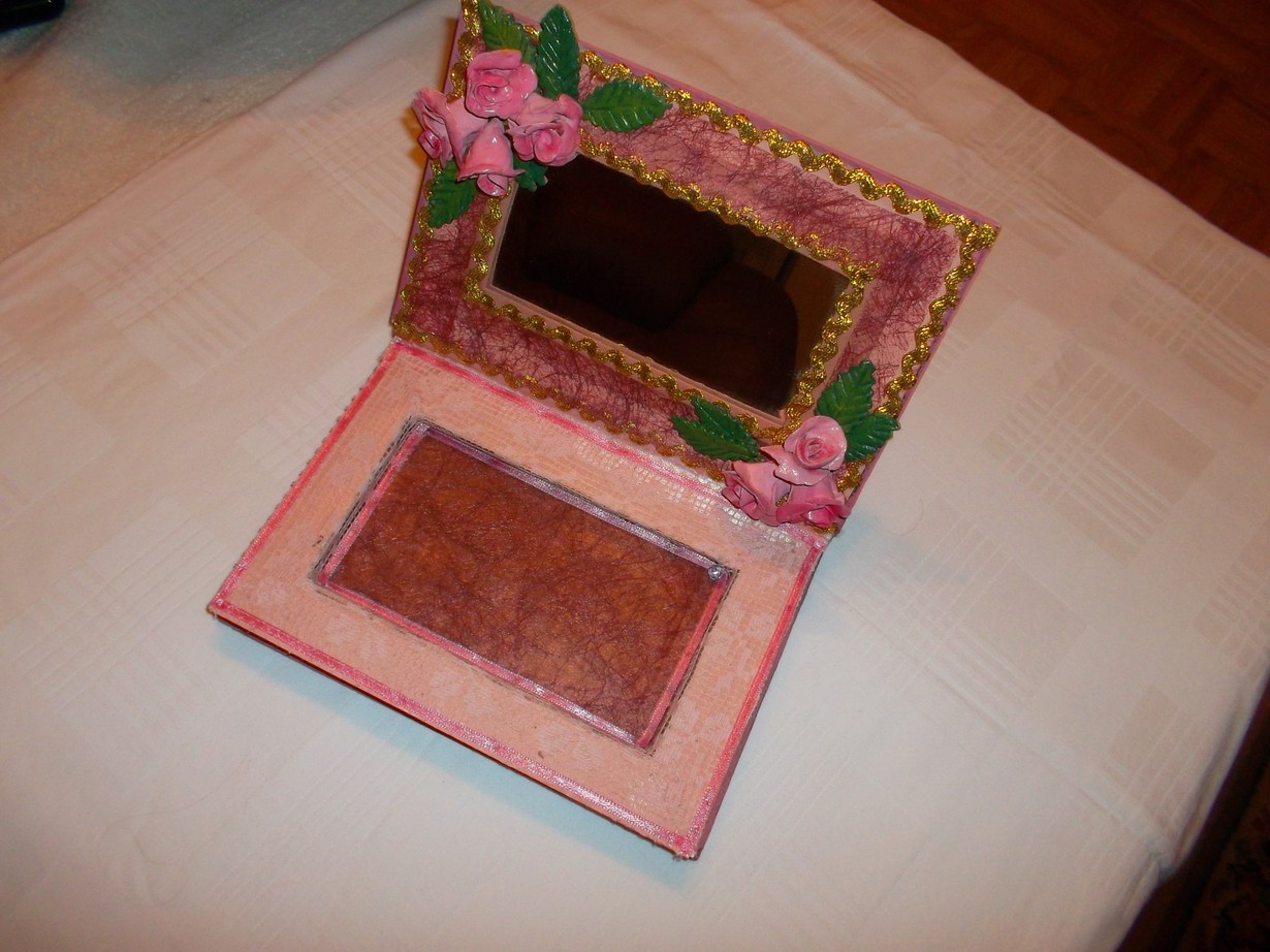 Vanahasta kirjasta tuunattu korurasia. Erilaisia papereita, nauhoja ja vanha peilinkappale sekä muovailumassaa sekä maalia ja uusi esine syntyy vanhasta materiaalista.