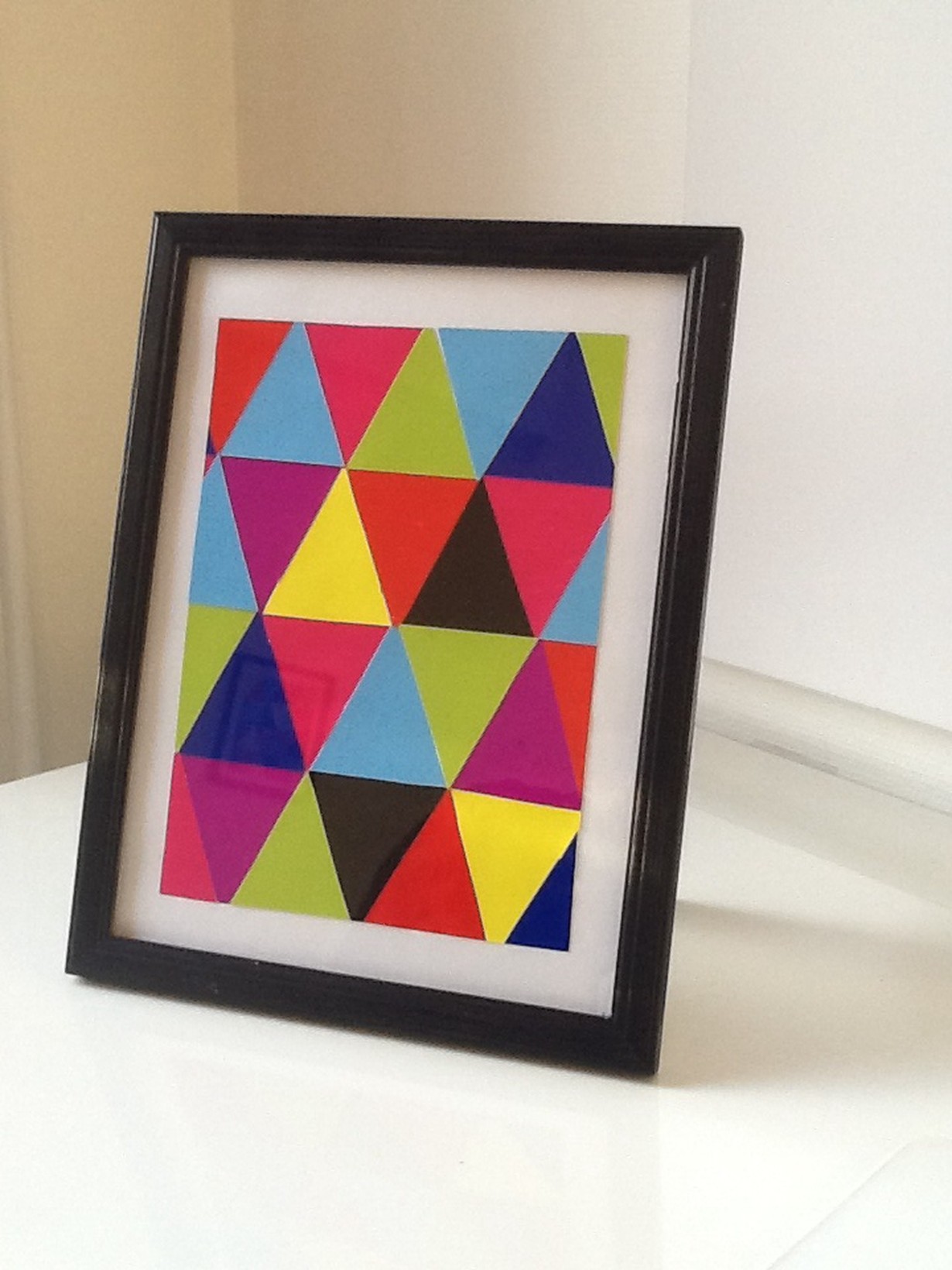 Värikkäässä taulussa on käytetty ylimääräisiä paperinpaloja ja tehty niillä kaunis ja yksinkertainen taulu. Mustat reunat korostavat viellä upeasti värien vahvuutta.