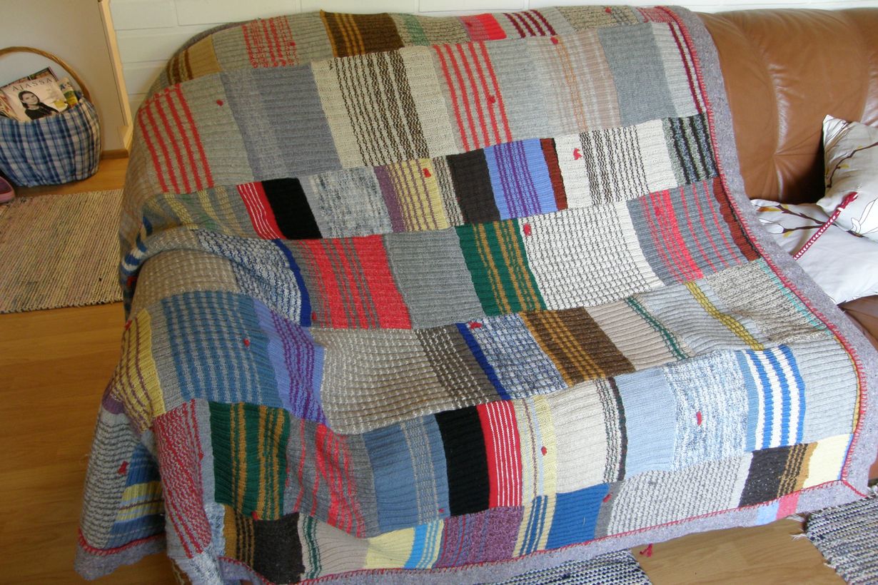 Vanhoista villasukista kaikki käyttökelpoiset varret leikattu auki ja ommeltu peitoksi. Vuoritettu tyyliin sopivalla vanhalla huovalla. Tästä peitosta löytää kädenjälkensä moni lähisukulainen. On myöskin hyvin lämmin.