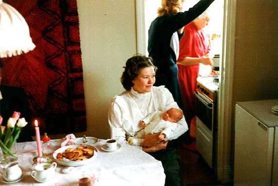 Kastejuhlassa äidin ja vauvan kotona pöydällä palaa vaaleanpunainen kynttilä. Maljakossa on tulppaaneja, lautasella pikkuleipiä, pappi saa taas kahvia juodakseen. Pitsipuseroon pukeutunut äiti pitelee hellästi pientä Annakaisa Helenaa.