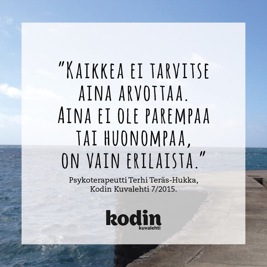 Asioiden arvottamisesta 15.5.2015 klo 14:53 "Kaikkea ei tarvitse aina arvottaa. Aina ei ole parempaa tai huonompaa, on vain erilaista." Psykoterapeutti Terhi Teräs-Hukka, KK 7/15. Tilaa Kodin Kuvalehti voimalause Tilaa Lue digilehtenä