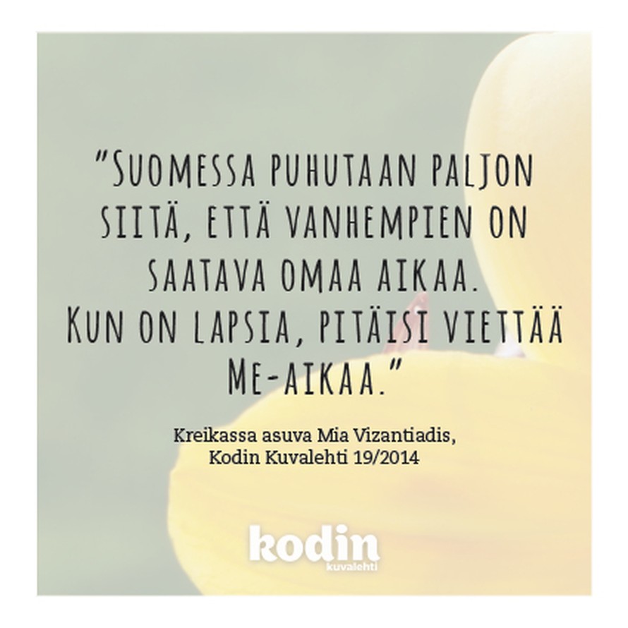 Ei omaa aikaa vaan me-aikaa 27.1.2015 klo 19:18 "Suomessa puhutaan paljon siitä, että vanhempien on saatava omaa aikaa. Kun on lapsia, pitäisi viettää me-aikaa." Kreikassa asuvat Mia Vizantiadis Oletko samaa mieltä? Kommentoi ja kerro. Tilaa Kodin Kuvalehti voimalause Tilaa Lue digilehtenä