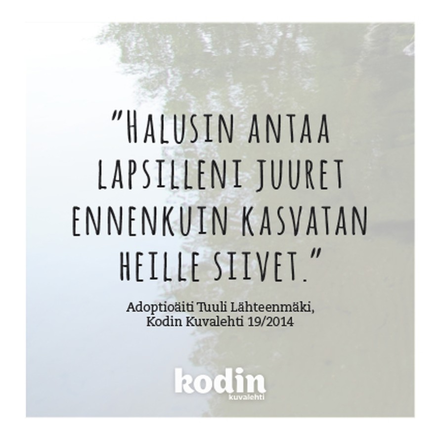 Ensin juuret, sitten siivet 4.2.2015 klo 18:04 "Halusin antaa lapsilleni juuret, ennekuin kasvatan heille siivet." Adoptioäiti Tuuli Lähteenmäki, KK19/2014 Mikä on sinun tämän päivän voimalauseesi? Kommentoi ja kerro. Tilaa Kodin Kuvalehti voimalause Tilaa Lue digilehtenä