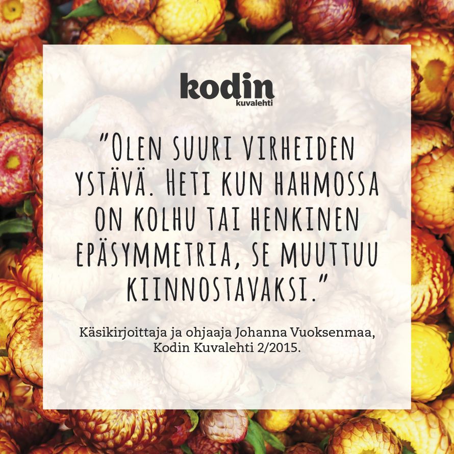 Epätäydellisyys on kiinnostavaa 7.3.2015 klo 14:50 "Olen suuri virheiden ystävä. Heti kun hahmossa on kolhu tai henkinen epäsymmetria, se muuttuu kiinnostavaksi." Käsikirjoittaja ja ohjaaja Johanna Vuoksenmaa, KK2/15 Tilaa Kodin Kuvalehti oivallus Tilaa Lue digilehtenä