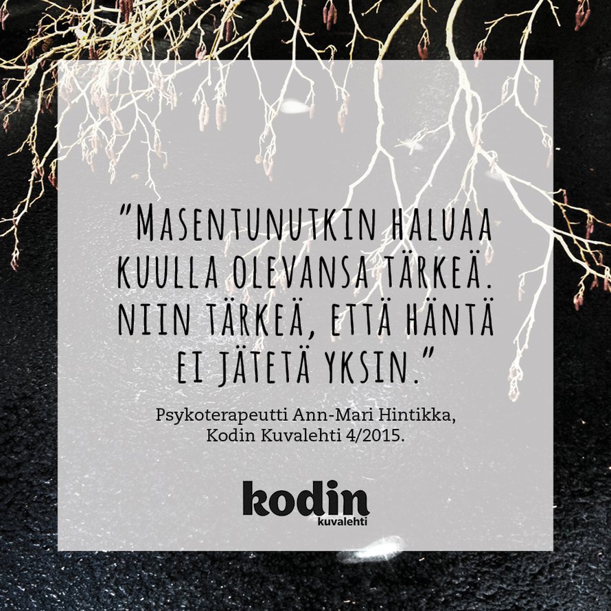 "Masentunutkin haluaa kuulla olevansa tärkeä. Niin tärkeä, että häntä ei jätetä yksin."