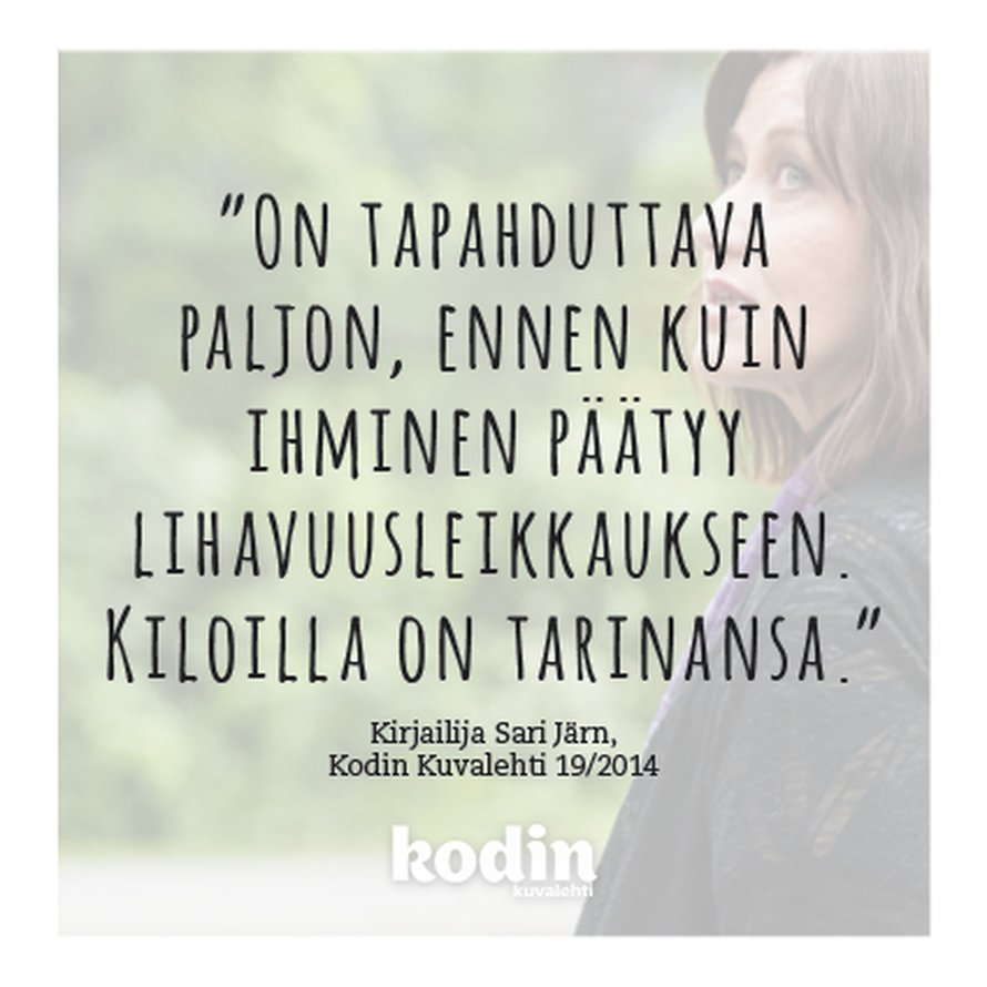 "On tapahduttava paljon, ennen kuin ihminen päätyy lihavuusleikkaukseen. Kiloilla on tarinansa." Kirjailija Sari Järn, KK19/2014
