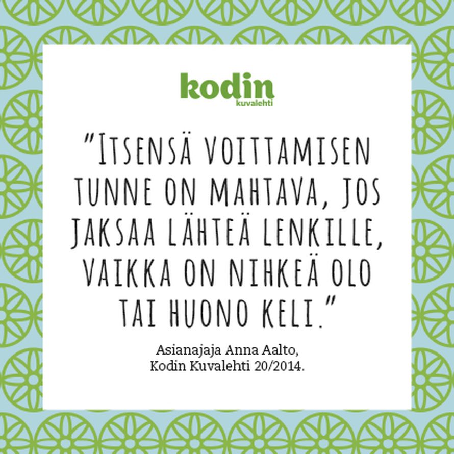 Itsensä voittamisesta 30.10.2014 klo 10:59 Mikä on sinun voimalauseesi? Kerro se meille muillekin kirjoittamalla kommenttikenttään. Tilaa Kodin Kuvalehti ajatus oivallus voimalause Tilaa Lue digilehtenä