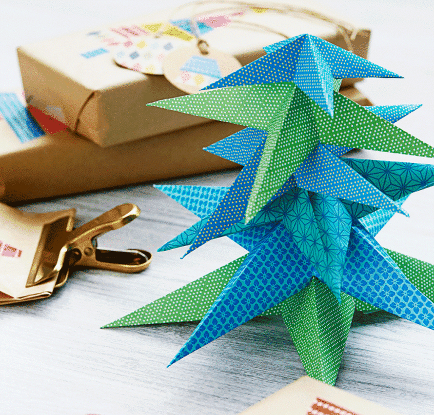Origamikuusi tehdään nelisakaraisista tähdistä.