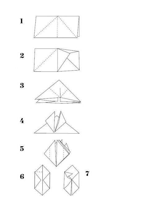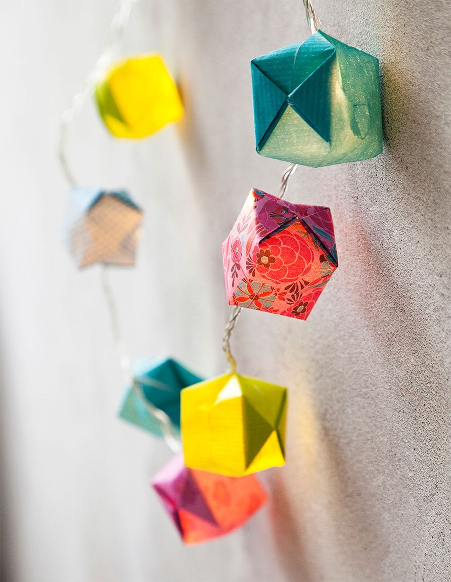 Leikkaa paperista 14 cm x 14 cm:n kokoisia neliöitä ja taittele ne oheisen piirroksen mukaan kuutioiksi. Pujota valonauhan polttimot kuution rei’istä sisään.