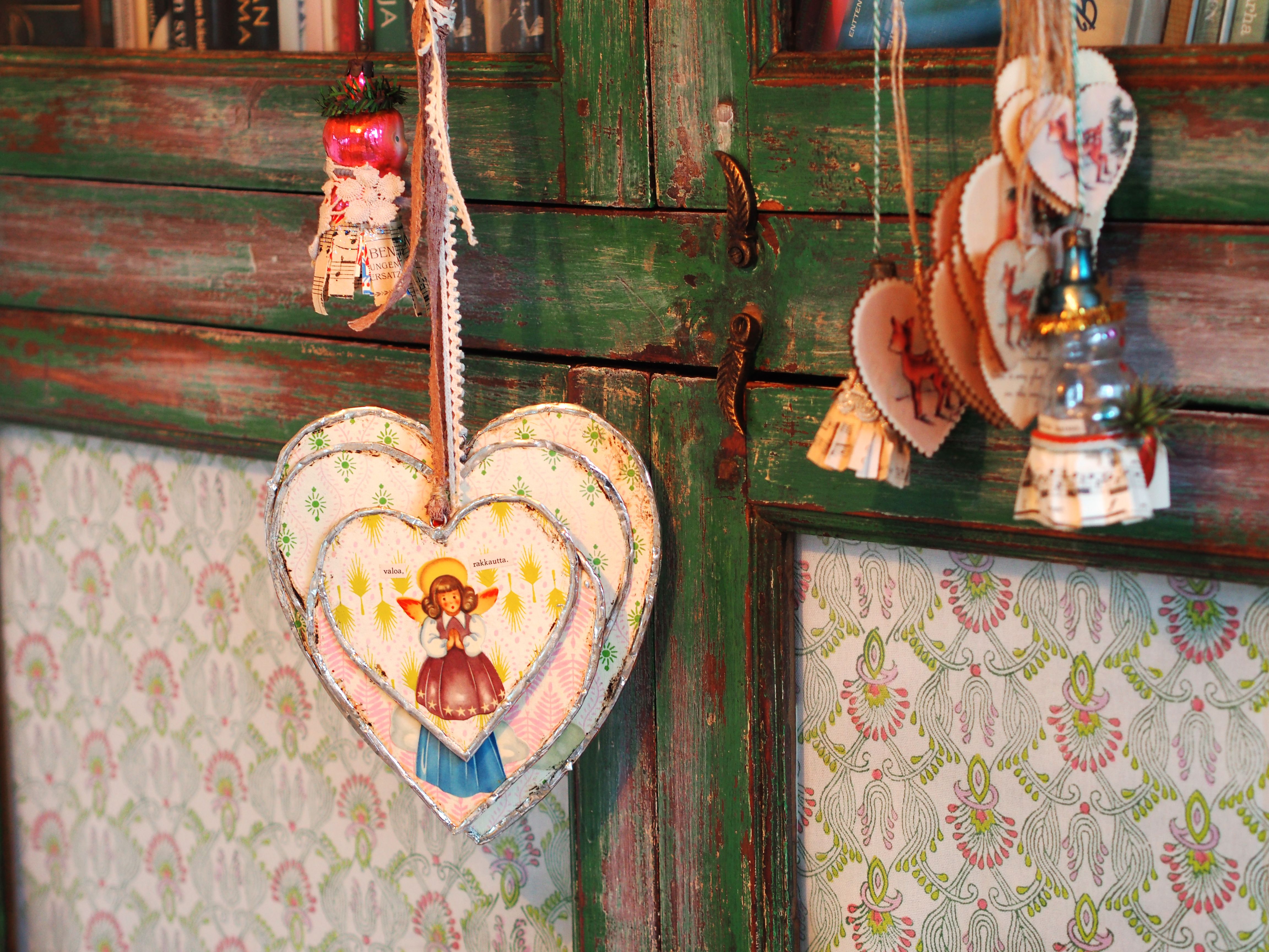 Kiti askartelee pääasiassa kierrätysmateriaaleista. Kiiltokuvista, kuusenkoristeista, vanhoista runokirjoista. Moni aarre on syntynyt rikkinäisestä esineestä, jota Kiti ei ole raaskinut heittää pois.